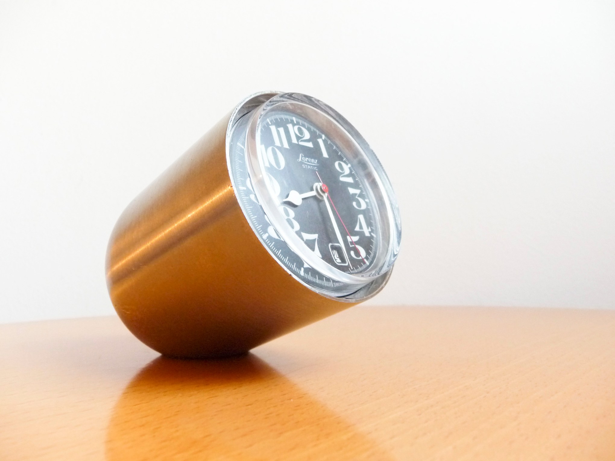 Famoso orologio da tavolo, con datario, disegnato da Richard Sapper e prodotto dalla Lorenz a partire dal 1959. Lo Static è stato progettato in risposta alla richiesta del produttore di esaurire il suo surplus di scorte di timers per aerosiluranti (il quadrante è una copia dell’orologio della cabina di pilotaggio).