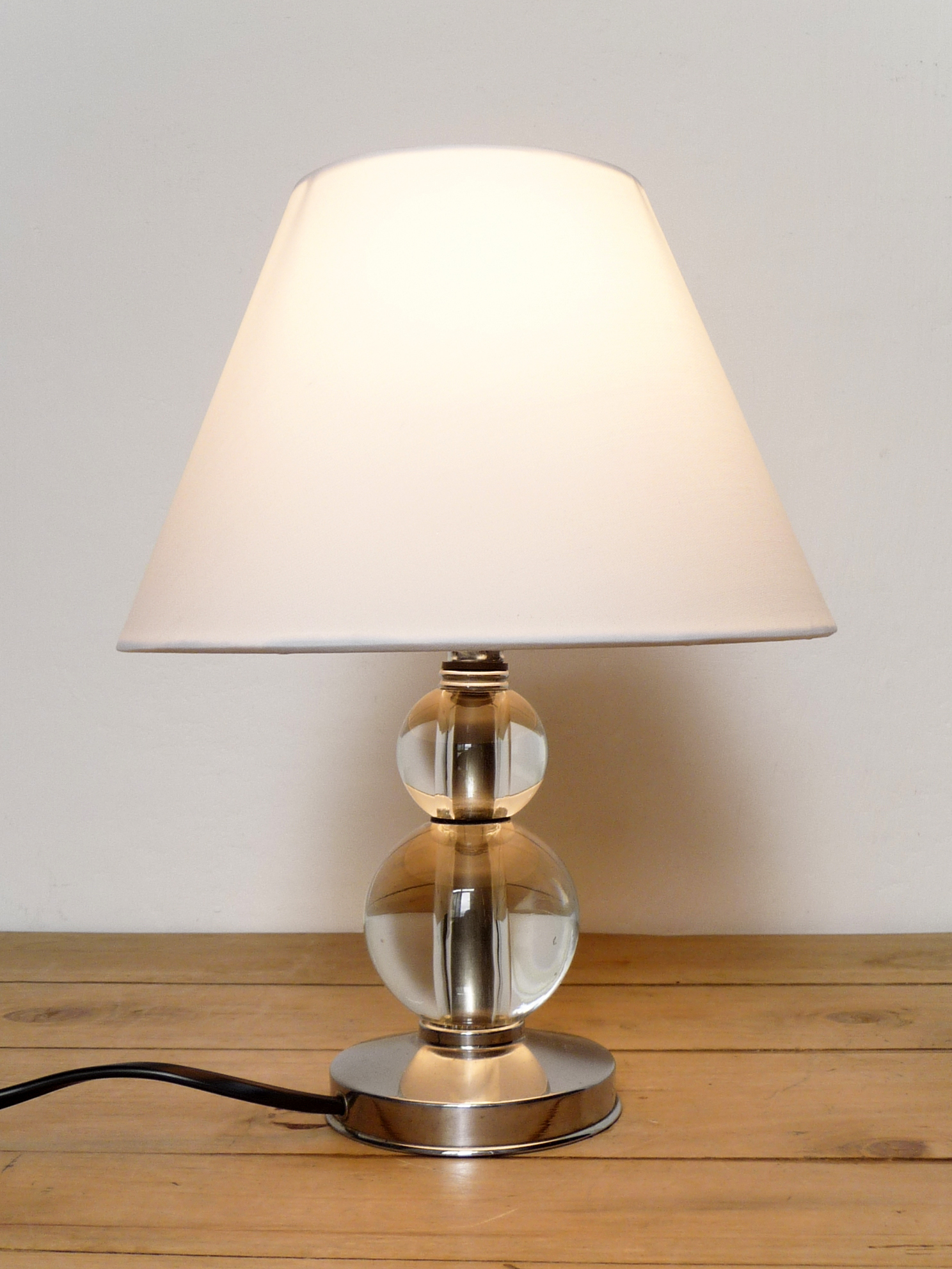 Piccola abat-jour di origine francese. La base è in metallo cromato e lo stelo è formato da due sfere in vetro sovrapposte.