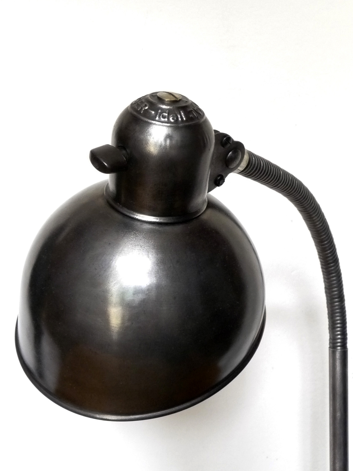Lampada da tavolo, con morsetto di fissaggio, progettata da Christian Dell e prodotta dalla Kaiser negli anni ’40/’50. Presenta un braccio parzialmente flessibile per consentire l’inclinazione del riflettore. L’asta rigida si innesta al morsetto con un giunto ruotabile di 360°. Il riflettore è fissato al braccio con il tipico giunto a sfera che gli permette di orientarsi. Il portalampadina, con interruttore a levetta, ha l’attacco E27.