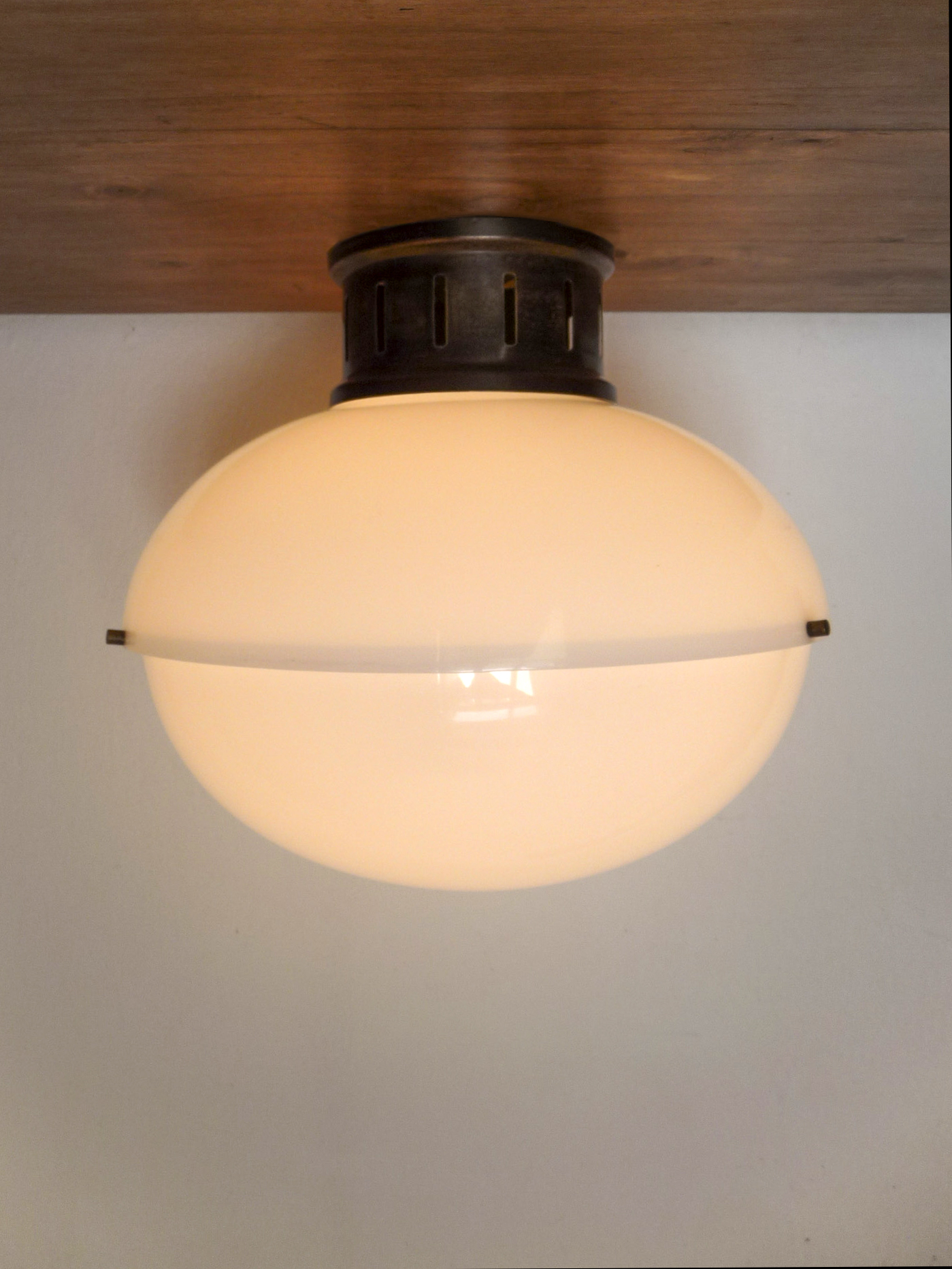 Lampada da plafone costituita da una struttura in ottone e da un paralume, in metacrilato opalino bianco, costituito da due calotte unite da tre viti in ottone.